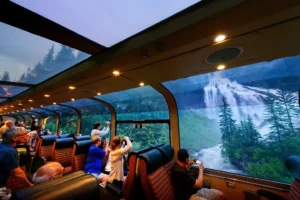 For train travel in Canada, the Rocky Mountaineer stands out as the premier scenic train. A multitude of routes traverse the most immaculate and unforgettable terrains of Western Canada. The most traditional route travels from Banff, located in the heart of the country’s first national park, to Vancouver, a gem on the Pacific Coast. Along the journey, passengers are treated to some of Canada’s most breathtaking scenery. Each route showcases views that ignite the imagination, including the Spiral Tunnels in Kicking Horse Pass and the iconic Stoney Creek Bridge on the First Passage to the West. Interpreters provide insights into the significance of everything the train encounters, including the vital coastal rainforests and the dramatic Fraser Valley and Canyon, which spans 167 miles across a rugged Gold Rush region, characterized by turbulent waterfalls, steep cliffs, and profound gorges. What is the most impressive element of an expedition aboard the Rocky Mountaineer? You won’t miss a moment of the stunning scenery. The train halts for an overnight stay where passengers have booked their accommodations in Kamloops. Thus, on the second day, passengers are refreshed, alert, and seated by their windows as the train descends through the coastal Cascade Mountains towards the Pacific Ocean. Consider indulging in the GoldLeaf service in a carriage car that boasts a glass dome for the best views.